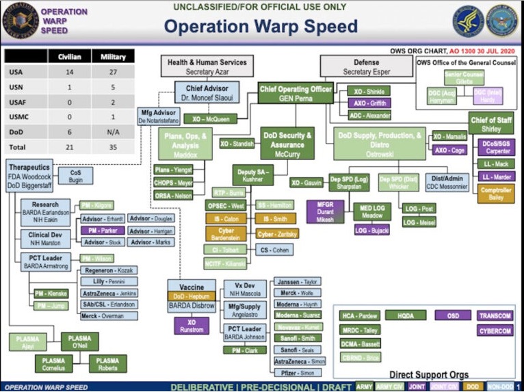 One was the organizational chart of its leadership, which showed that by and large, the entire operation is dominated by military. There were very few civilian health officials, and most of those civilian health officials are involved in the therapeutic side of Warp Speed, which as we know now is the most drastically underfunded part of this initiative.