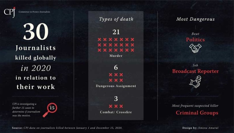 CPJ also reports that murders of journalists has more than doubled in 2020, compared to 2019. The murders are often labeled as “retaliatory killings” committed by gangs and/or militants in “violent but democratic nations”