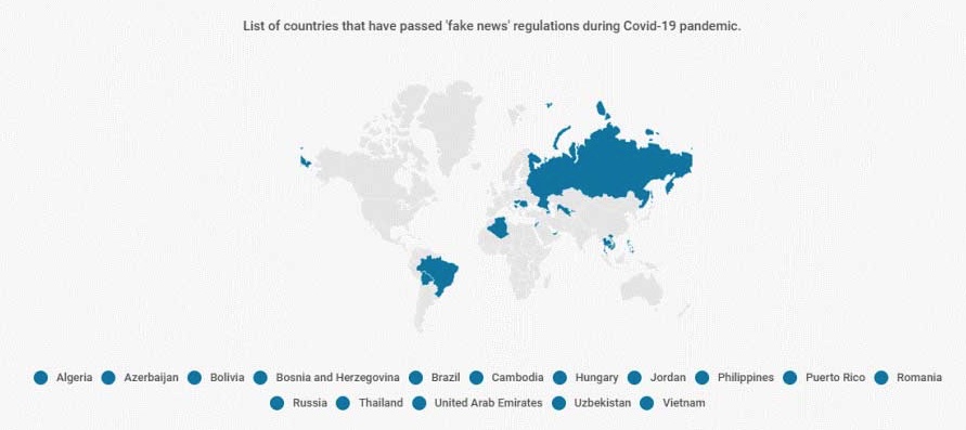 Countries that now have laws on the books that restrict reporting of news about COVID-19 and call for fines and/or the arrest of journalists accused of spreading misinformation about the virus are shown in the graphic above.