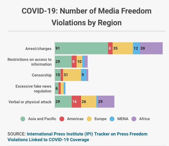 IPI, which has been monitoring press freedom restrictions during the pandemic, also released the following image, showing the number of press freedom violations recorded across the world.