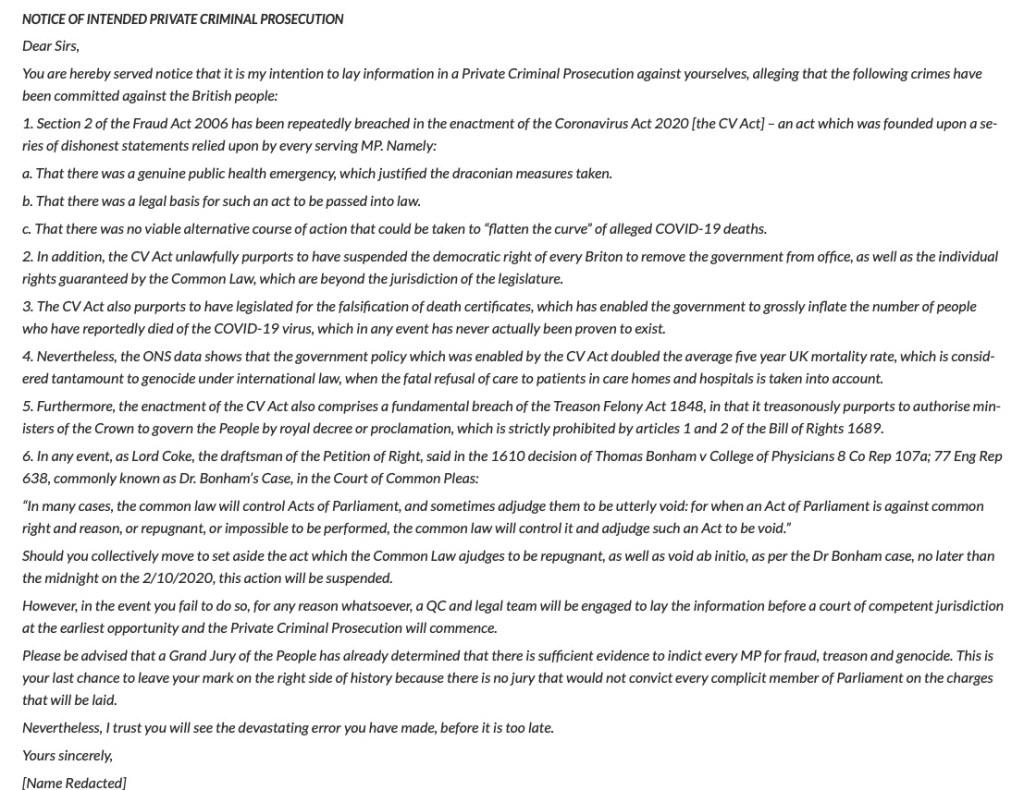 “A covert war has been waged against the people of the United Kingdom (and the world) through the release of the biological weapon SARS-Cov-2 and the additional bioweapon, m-RNA gene therapy ‘vaccines.”