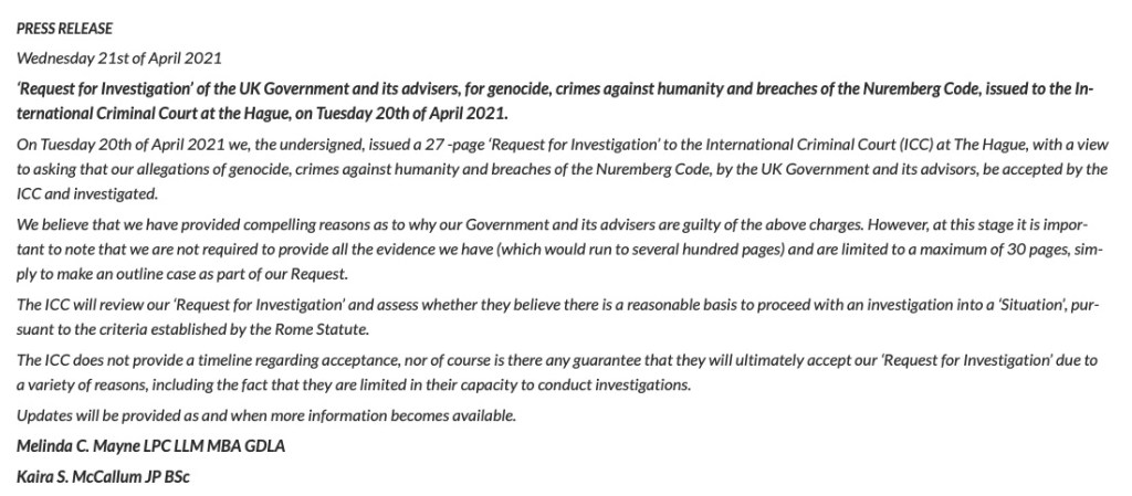 It is of the utmost urgency that ICC take immediate action, taking all of this into account, to stop the rollout of COVID vaccinations, introduction of unlawful vaccination passports and all other types of illegal warfare mentioned herein currently being waged against the people of the United Kingdom by way of a court injunction.”