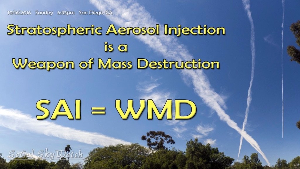 SAI is essentially the spraying of aerosols (typically aluminium oxide, barium, strontium, sulphuric acid and other toxic substances) by aeroplanes into the Earth’s atmosphere, modifying the weather in order to affect local and global climate.