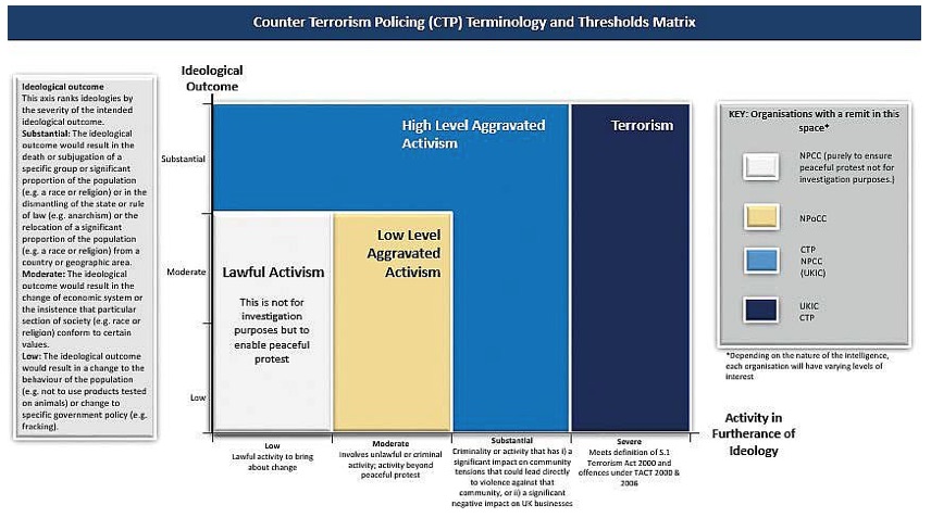However, the “threshold and terminology matrix” says that taking action in support of such aims rather than simply talking about them – something that does not appear to have any effect on governments – will push campaigners from so-called lawful activism to low-level aggravated activism.