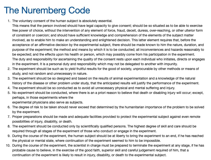 The Nuremberg Code rejects the ideology of eugenics and unequivocally asserts the primacy and dignity of the individual human being – as opposed to “the greater good of society.”
